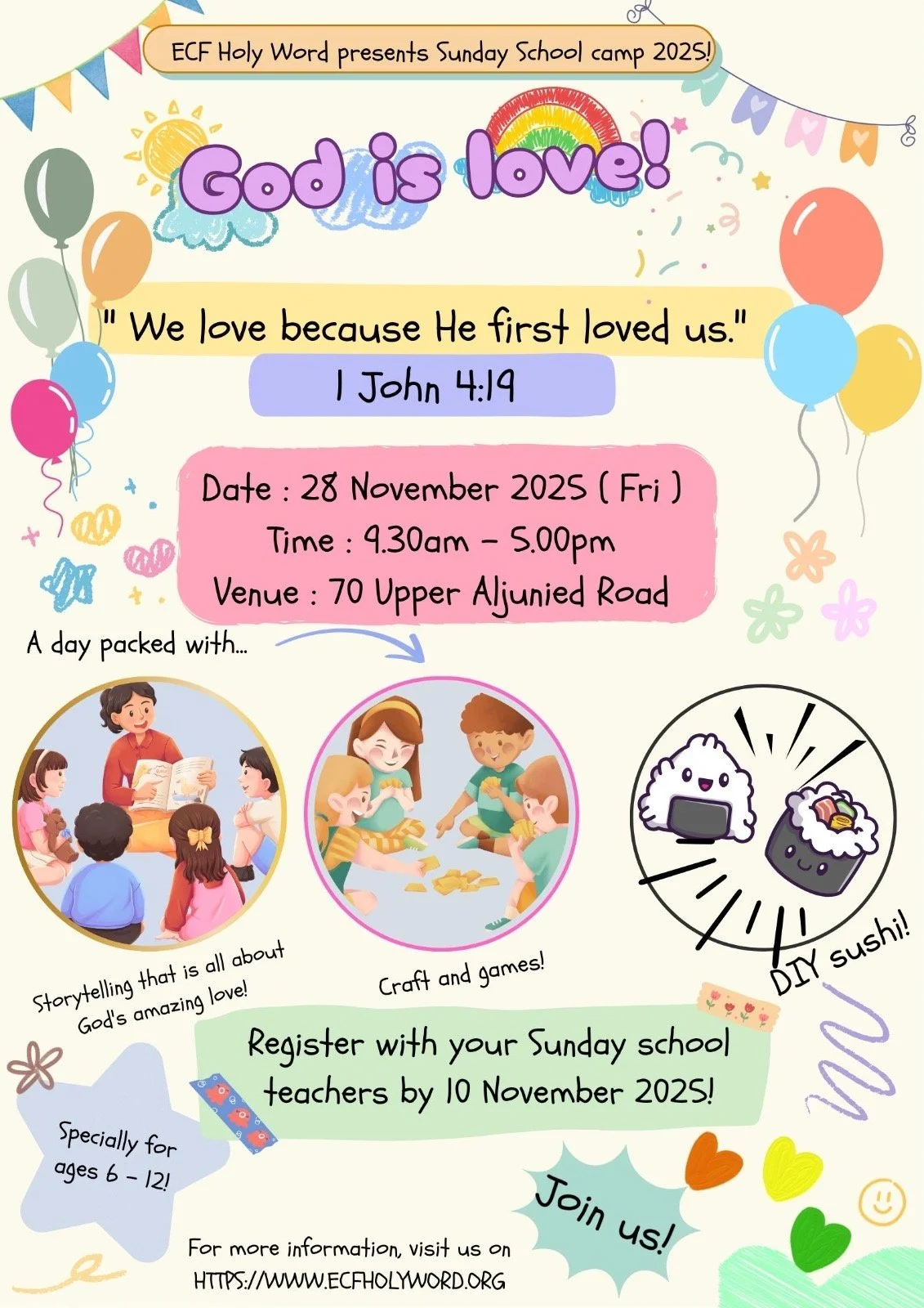 ECF Sunday School camp is the perfect way for kids to spend their school holidays. With the entire day of games, bible stories and prizes to be redeemed from our very own "mama shop". Your child will have an incredible time learning with our volunteers.