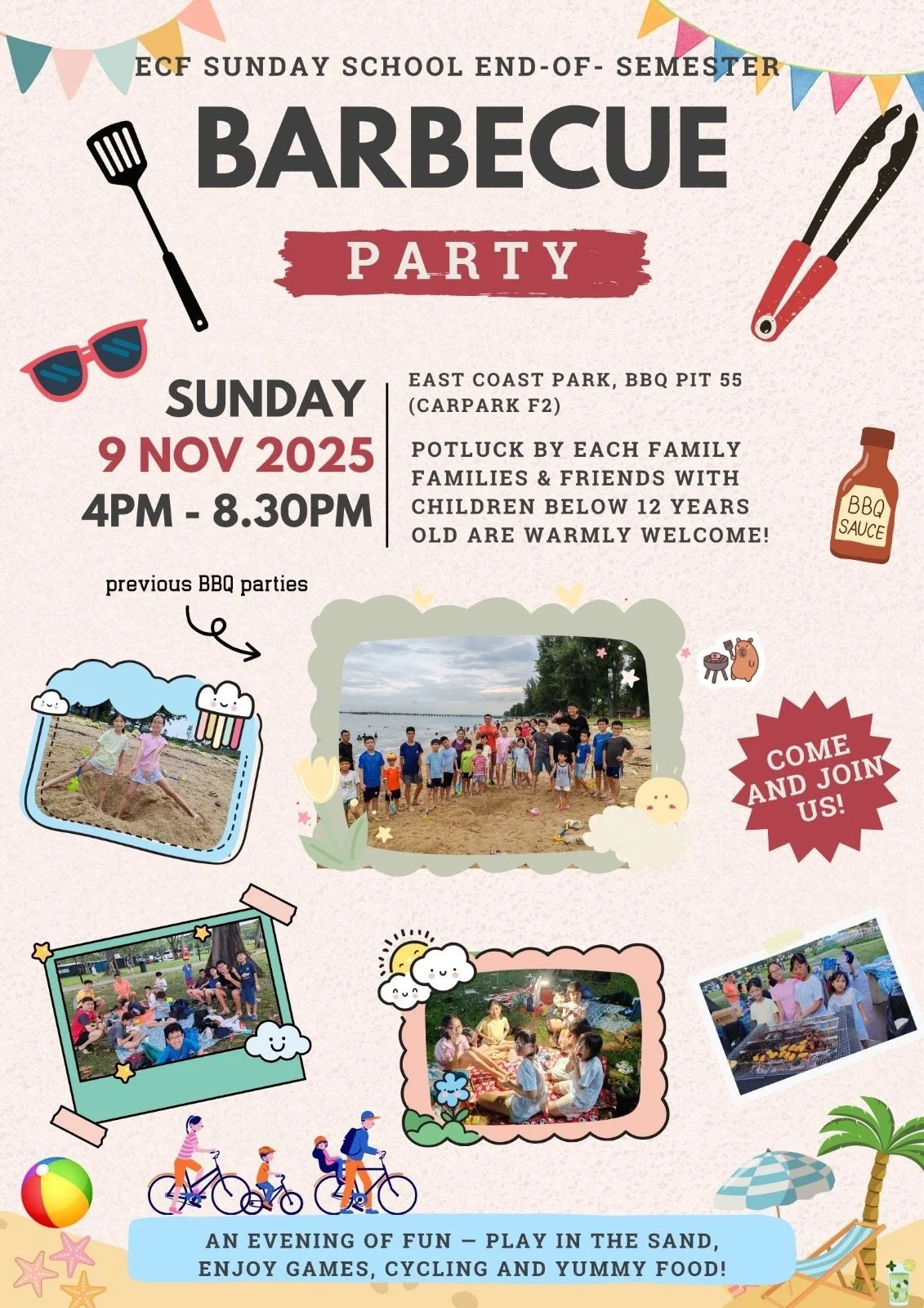 ECF Kids will be having an End-of-Semester Barbecue Party on 9 November 2025 (Sun) from 4pm to 8.30pm at East Coast Park, BBQ Pit 55 (Carpark F2). Families and friends with children below 12 years old are warmly welcome to join an evening of fun, games, cycling and yummy food. Do invite your new friends to come along and enjoy this special time together!